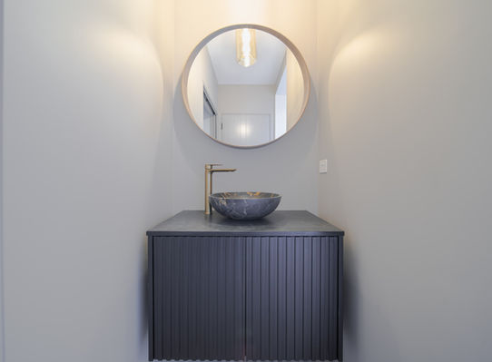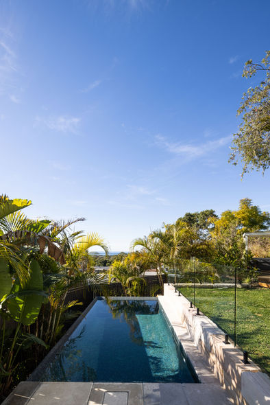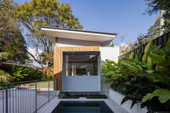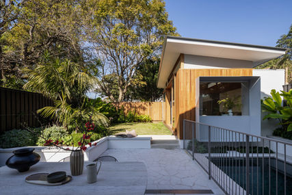 This project demanded meticulous planning and skilled execution - the old pool was removed and a new one was craned in. An architectural pool house with a floating timber-wrapped beam above the doors was built, and the front and backyards were landscaped. Blackbutt cladding was installed with custom AC grills routed in, Beautiful microcement was then placed in the bathroom and wet bar giving some texture. The rear house doors were opened up, and a new driveway, front gate, and fencing have been added.